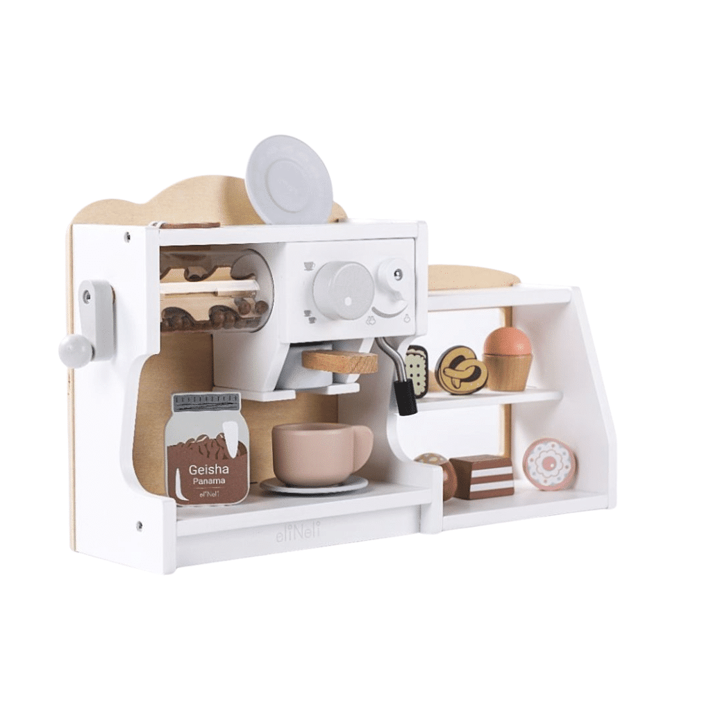 2-i-1 kaffemaskine og cafeLeg og læring i ét trælegetøj med dobbelt funktionLarge Wooden Coffee Machine & Shop 2i1 er den ultimative legeoplevelse for nysgerrige børn med hang til rolleleg. Her får du både en stor, flot kaffemaskine og en lille butik